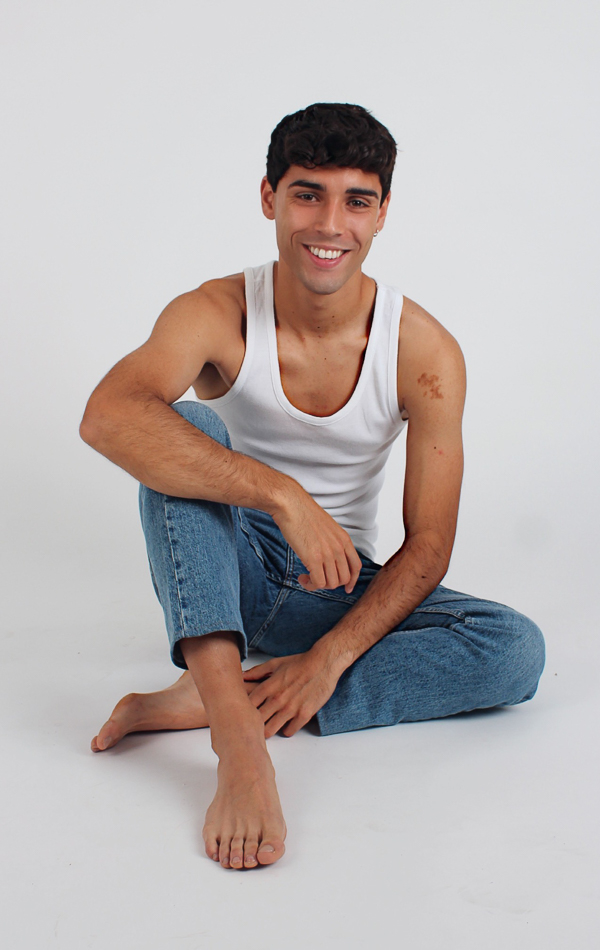 Modelo chico, ojos marrones con pelo oscuro en camisa de tirantes blanco y tejanos