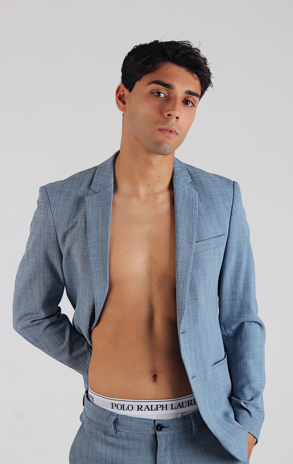 Modelo chico pelo oscuro, ojos marrones en traje gris