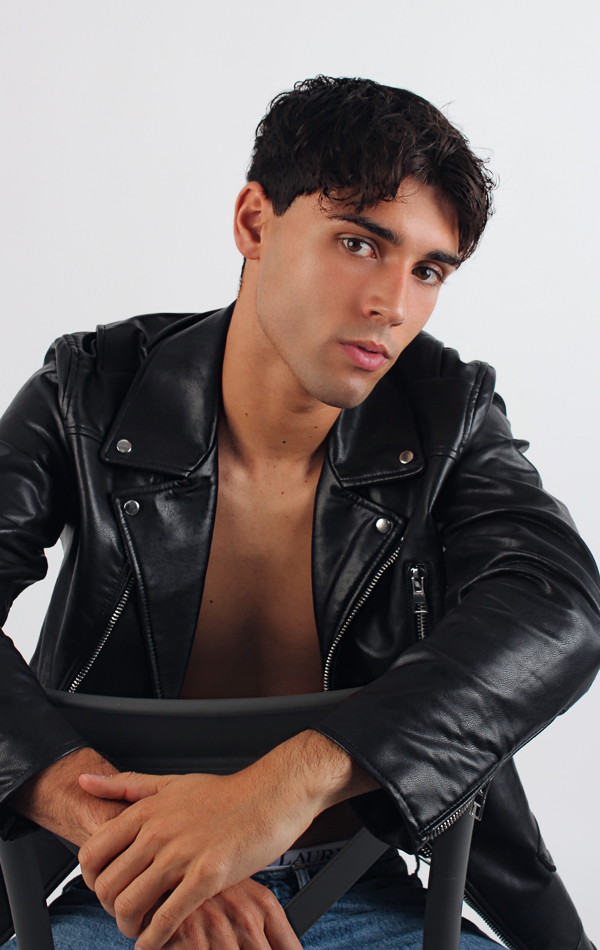 Modelo chico con pelo oscuro y ojos marrones con chaqueta de cuero