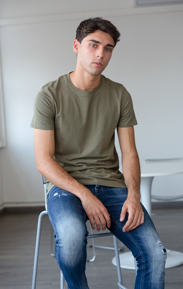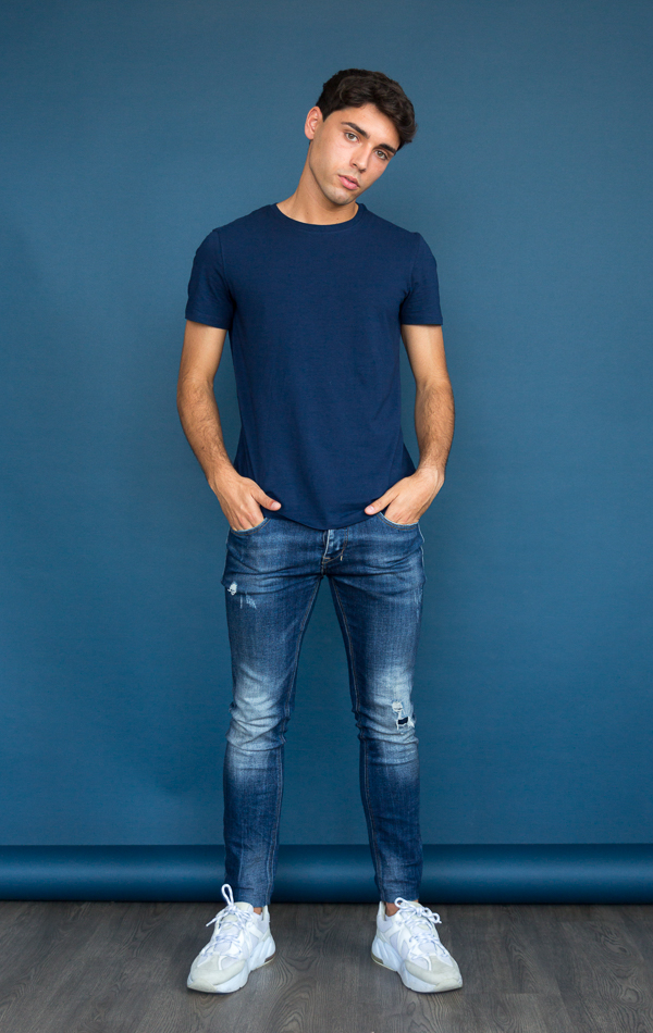 Modelo chico ojos marrones con pelo oscuro camiseta azul y tejanos
